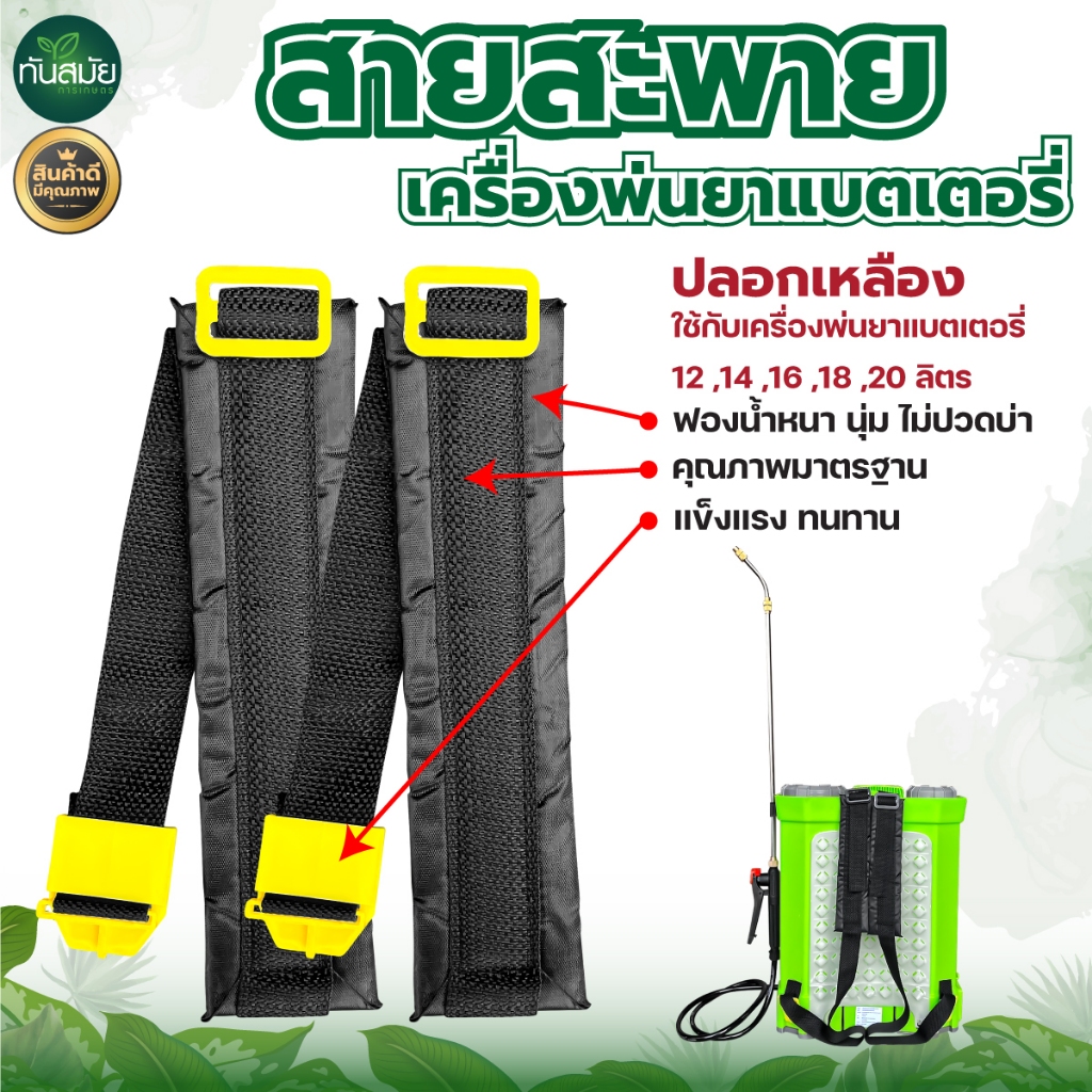 ... ่ห้อ 4.คุณภาพสูงมีอายุการใช้งานนาน 5.ปรับระดับความยาวสายได้ ชื่อสินค้า : สายสะพาย ใช้ได้กับ : เครื่องพ่นยาแบตเตอรี ประเภท : อุปกรณ์เสริม บรรจุ : 1 คู่ คุณสมบัติ : 1.ตัวล็อคตัวถังเหนียว 2.แข็งแรง 3.ไม่เปราะง่าย 4. หนา 5.นุ่ม (สบายบ่า) ⭐ข้อแนะนำเมื่อได้รับสินค้า⭐ 1.รบกวนลูกค้าถ่ายวิดิโอขนาดเปิดสินค้า เพื่อประโยชน์ของลูกค้าเอง หากสินค้าไม่ครบหรือเกิดความเสียหายจากโรงงานการผลิตหรือระหว่างขนส่ง ลูกค้าสามารถส่งวิดิโอเพื่อขอเคลมสินค้าได้ภายใน 24 ชั่วโมง - หมายเหตุ : ถ้าไม่มีวิดีโอหรือรูปภาพและไม่แจ้งภายใน 24 ชั่วโมง ทางร้านไม่รับประกันใดๆ - เมื่อได้รับสินค้าแล้วควรเปิดกล่องเช็คสินค้าทันที 2.หากลูกค้ามีหลักฐานจะง่ายต่อการเคลมสินค้าเร็วขึ้น 3.หากมีข้อส่งสัยทักสอบถามแอดมินได้ทันที ****โปรดอ่าน**** 1.ทางร้านตรวจสอบสินค้าก่อนส่งทุกครั้ง เพื่อให้ลูกค้าได้รับสินค้าที่มีคุณภาพ 2.หากลูกค้าไม่มั่นใจหรือสงสัยข้อมูลเกี่ยวกับสินค้า ลูกค้าสามารถทักข้อความหาแอดมินเพื่อทำการสอบถามแอดมินได้ในเบื้องต้น 3.เมื่อได้รับสินค้าแล้ว รบกวนลูกค้าถ่ายวิดีโอหรือรูปภาพไว้และแจ้งแอดมิน หากพบว่าสินค้าเกิดความเสียหาย ***หลังจากได้รับรับสินค้าจากบริษัทขนส่ง ถ้าได้สินค้าไม่ครบหรือสินค้าเสียหายระหว่างขนส่งให้ลูกค้าแจ้งแอดมินช่องทางร้านทันสมัยการเกษตร ในSHOPEEพร้อมวิดีโอและภาพถ่ายยืนยัน หมายเหตุ : ถ้าไม่มีวิดีโอหรือรูปภาพและไม่แจ้งภายใน 24 ชั่วโมง ทางร้านไม่รับประกันใดๆ ทั้งสิ้น**