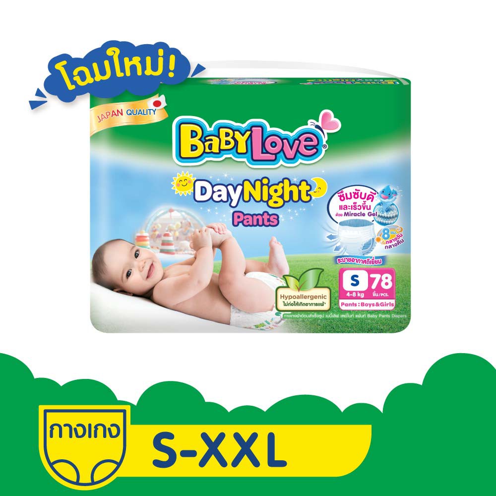 ... ้งรอยแดงบนผิวลูกน้อย ด้วย Comfy Elastic fit - ลวดลายสัตว์ น่ารัก สดใส พร้อมคำศัพท์ภาษาอังกฤษ - พร้อมผลทดสอบว่าไม่ก่อให้เกิดอาการแพ้ New! BabyLove Day&Night – powered by our “Miracle Gel” for more effective and faster absoption, no worry about leakage Baby stay fresh Day+Night for up to 8 hrs. Clinically proven Hypoallergenic test to protect your baby’s sensitive skin from irritation. BabyLove DayNight Pants Mega Pack Size S (78 Pcs.) BabyLove DayNight Pants Mega Pack Size M (74 Pcs.) BabyLove DayNight Pants Mega Pack Size L (62 Pcs.) BabyLove DayNight Pants Mega Pack Size XL (54 Pcs.) BabyLove DayNight Pants Mega Pack Size XXL (48 Pcs.s) Size mega ส่วนประกอบ แผ่นใยสังเคราะห์ • โพลิเมอร์ • เยื่อกระดาษ • โพลิเอทิลีน • โพลิยูลิเทน • กาว อายุการเก็บรักษา 36เดือนนับจากวันที่ผลิต