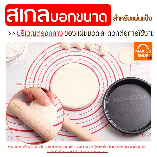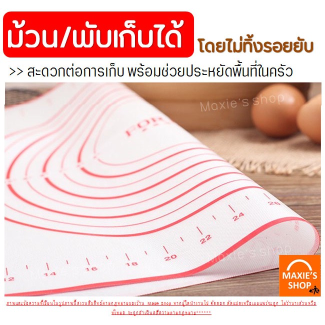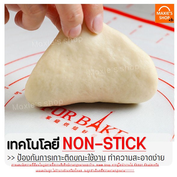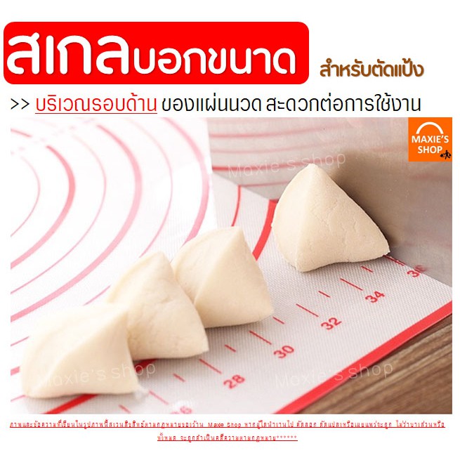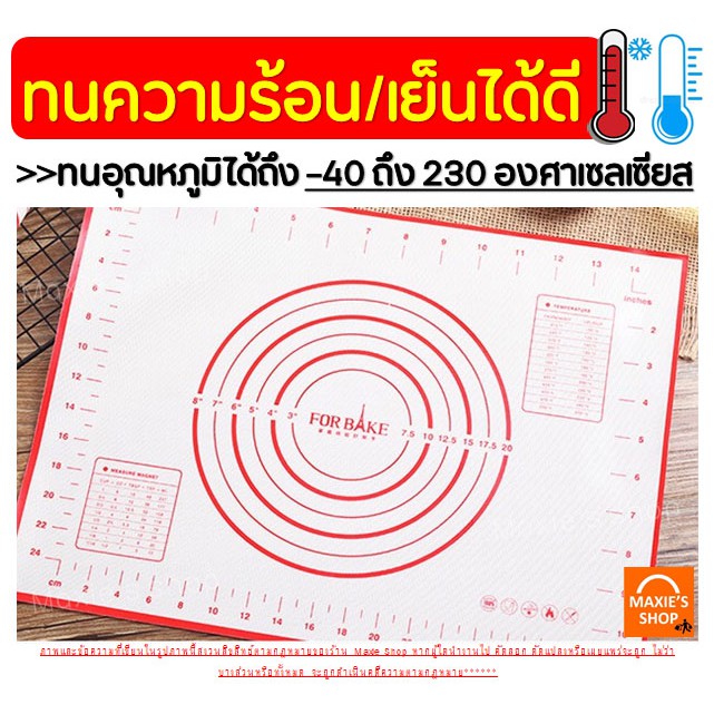 แผ่นซิลิโคนนวดขนมปัง MAXIE Premium Plus (มีให้เลือกถึง 3 ขนาด ได้แก่ 29 * 26 ซม., 40*60 ซม., 60*80 ซม.) อุณหภูมิที่รองรับได้: -40ถึง230องศาเซลเซียส จุดเด่น:แผ่นรองอบวัสดุซิลิโคนที่ผสมใยไฟเบอร์กลาสคุณภาพดี ช่วยให้มีคุณสมบัติอ่อนนุ่ม น้ำหนักเบาและทนทานกว่าแผ่นรองนวดทั่วๆไป พร้อมสเกลไม้บรรทัดรอบด้า