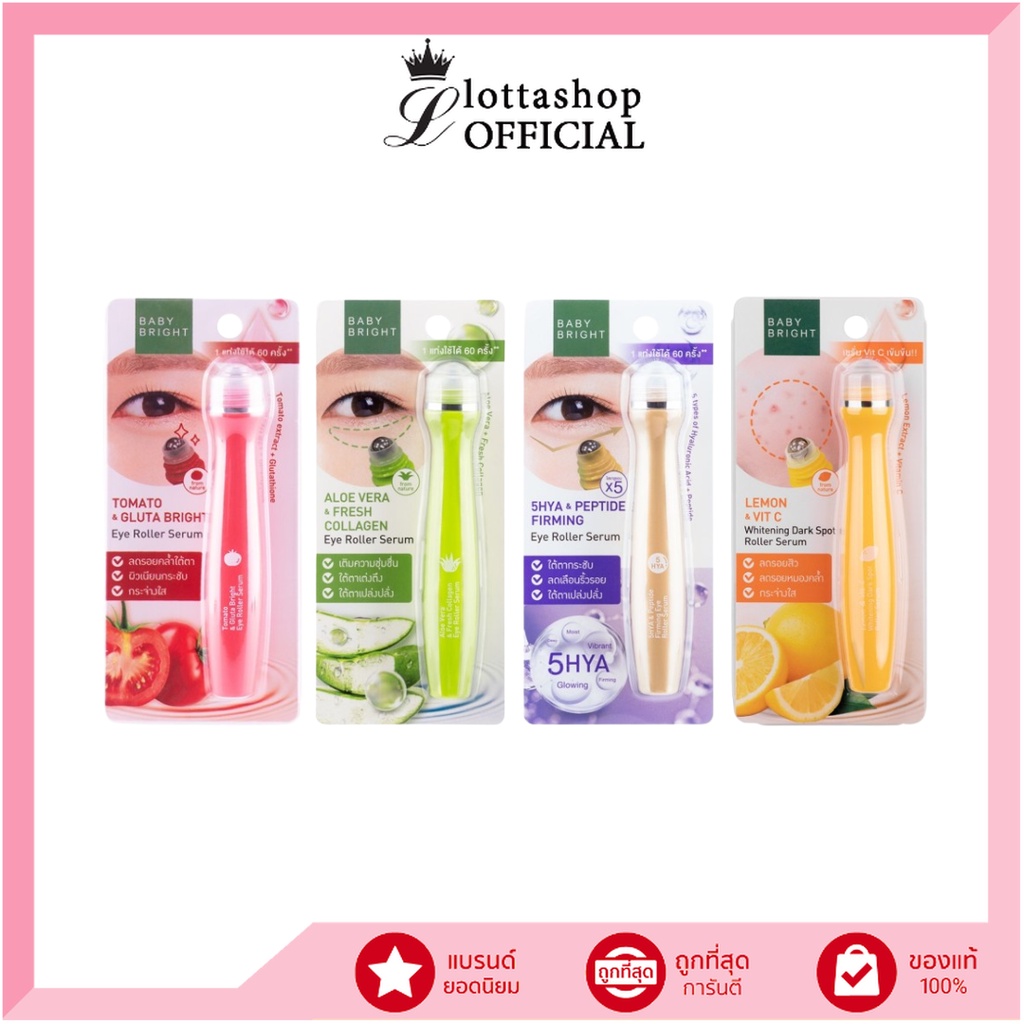 ... ี่แตกง่ายค่ะ 👑 สินค้าพร้อมส่งทุกรายการค่ะ 🎀 ได้รับสินค้าสินค้าแล้วรบกวนถ่าย📷VDOก่อนแกะกล่องทุกครั้งค่ะ 👑 ถ้าได้รับสินค้าผิดหรือไม่ครบกรุณาทักแชทก่อน อย่าพึ่งรีวิวหักดาวกันนะคะ 🌷🌼🌷🌼🌷🌼🌷🌼🌷🌼🌷🌼🌷🌼🌷🌼🌷🌼🌷🌼🌷🌼🌷 BABY BRIGHT โทเมโทแอนด์กลูต้าไบร์ทอายโรลเลอร์เซรั่ม 15ML เซรั่มลูกกลิ้งบำรุงใต้ตาที่อุดมไปด้วยสารสกัดจากมะเขือเทศ ซึ่งมีสารไลโคปีน เป็นสารต้านอนุมูลอิสระที่ช่วยชะลอการเกิดริ้วรอย และช่วยบำรุงใต้ตาที่อ่อนล้ากลับมาสดใสได้อีกครั้ง BABY BRIGHT ALOE VERA & FRESH COLLAGEN EYE ROLLER SERUM 15ML ลูกกลิ้งแบบใหม่ที่ออกแบบให้รู้สึกเย็นและเรียบเนียนด้วยเม็ดบีดที่ทำให้บริเวณผิวรอบดวงตาชุ่มชื้น เย็นสบาย บรรเทาความเมื่อยล้าของดวงตา ริ้วรอยจางลง ทำให้ดวงตาสดใส มีชีวิตชีวา และอ่อนเยาว์ Baby Bright 5Hya & Peptide Firming Eye Roller Serum เซรั่มโปร่งแสงที่ช่วยฟื้นฟูรอยคล้ำให้ดูกระจ่างใสอย่างมีประสิทธิภาพ BABY BRIGHT LEMON & VITC WHITENING DARK SPOT ROLLER SERUM 15ML คืนความกระจ่างใสให้ผิวสวยด้วยลูกกลิ้งที่ออกแบบมาเป็นพิเศษในการนวดและเพิ่มการไหลเวียนโลหิต ผสานคุณประโยชน์จากมะนาวที่มี Alpha Hydroxy Acids (AHA) ช่วยผลัดเซลล์ผิวที่ถูกทำลายให้เรียบเนียนกระจ่างใส