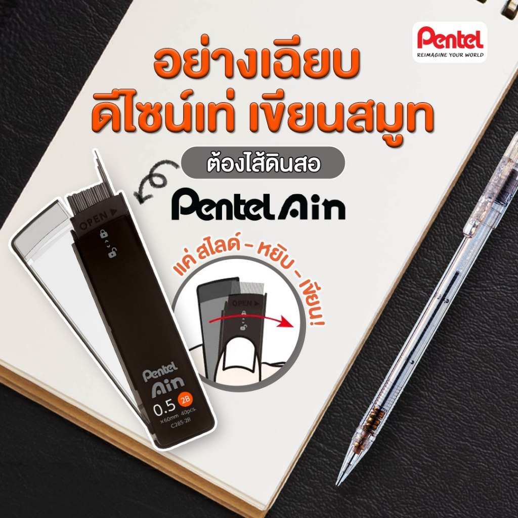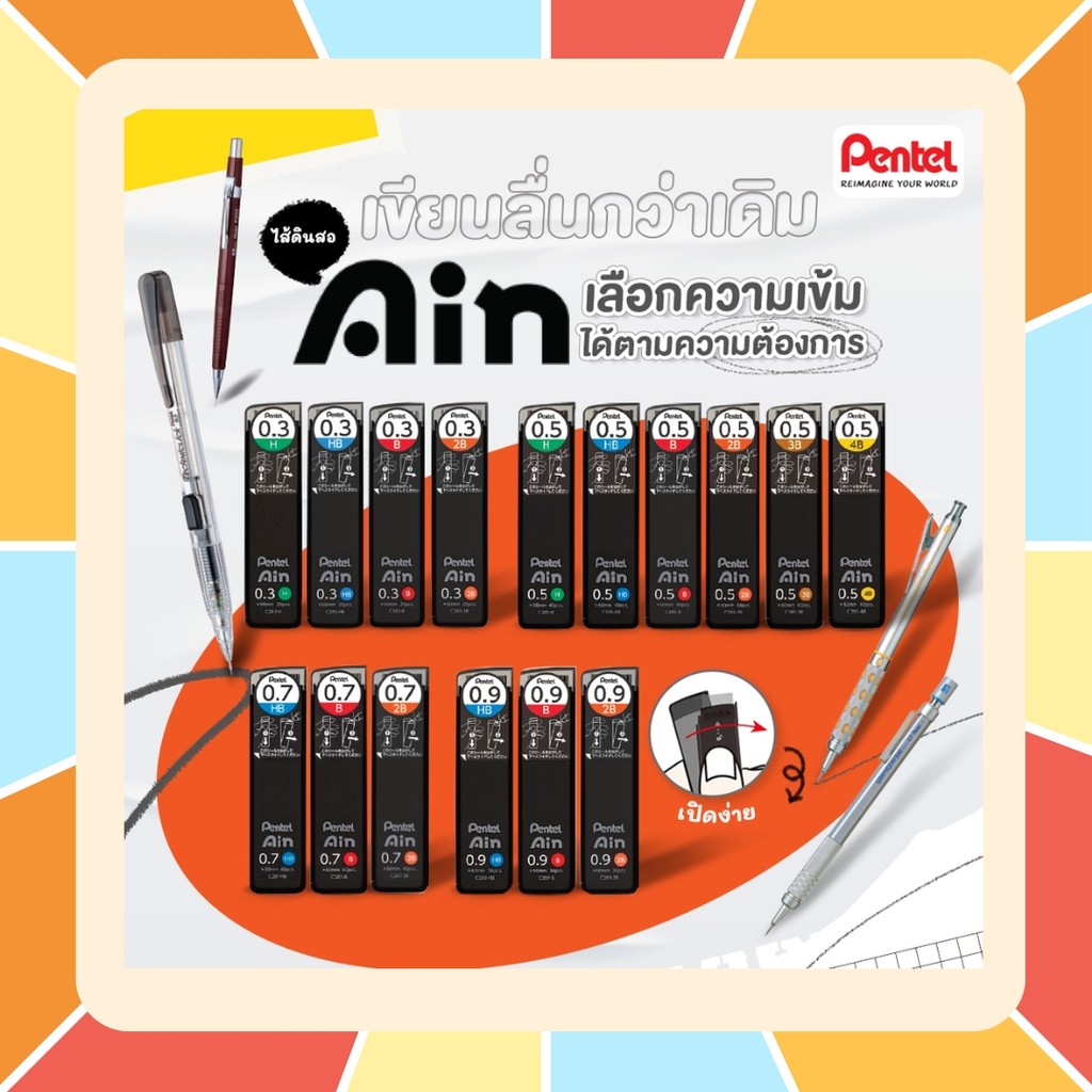 ไส้ดินสอ Pentel Ain รุ่นใหม่ มีให้เลือกหลายขนาด ตั้งแต่ 0.3 ถึง 0.9 MM มีให้เลือกหลายความเข้ม ไส้ดินสอกด