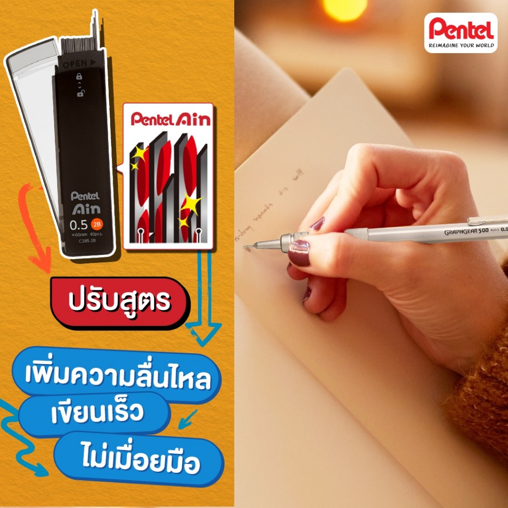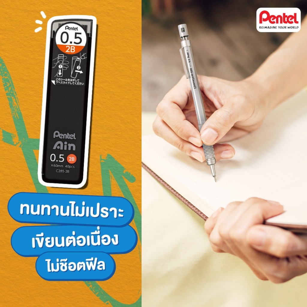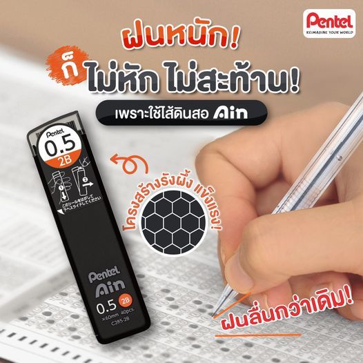 ... 0.3 ถึง 0.9 MM มีให้เลือกหลายความเข้ม ไส้ดินสอกด 3 เหตุผลที่ว่าทำไม Pentel Ain ถึงเหมาะกับทุกไลฟ์สไตล์การใช้งาน ✅ ทนทานไม่เปราะ เขียนต่อเนื่องไม่ช๊อตฟีล ✅ ปรับสูตรเพิ่มความลื่นไหล เขียนเร็ว ไม่เมื่อยมือ ✅ เปิดใช้งานง่ายไม่โดนเท 🎯 ไส้ดินสอกด รุ่นพิเศษ จาก Pentel ไม่เปราะหักง่าย 🎯 ผลิตจากวัสดุรีไซเคิลถึง 92% ผลิตจากประเทศญี่ปุน 🎯 สูตรการผลิตอย่างมีเอกลักษณ์ ในการผสมซิลิก้าเข้าไปในไส้ ช่วยให้ไส้แข็งแรง ไม่หักง่าย 🎯 ไส้ดินสอเขียนสบาย ลื่น ไม่ต้องใช้แรงเยอะ 🎯 ขนาดไส้ดินสอมีให้เลือก 2 ขนาด 0.3 และ 0.5 มม. - มีความเข้มของไส้ให้เลือกหลายระดับ : B HB 2B 3B 4B - ไส้ขนาด 0.3 บรรจุ : 15 ไส้/หลอด - ไส้ขนาด 0.5 บรรจุ : 40 ไส้/หลอด - ราคาเป็นราคาต่อหลอด 📌สินค้าพร้อมส่ง