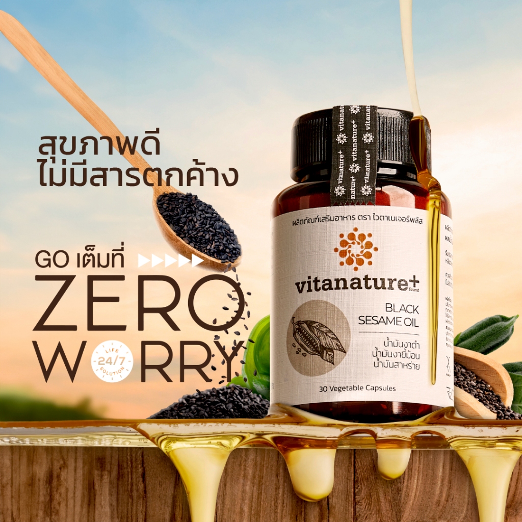 Vitanature+ Black Sesame Oil ผลิตภัณฑ์เสริมอาหาร น้ำมันงาดำ ผสมน้ำมันงาขี้ม้อน (ตรา ไวตาเนเจอร์พลัส) อุดมไปด้วยสารอาหารที่จำเป็นต่อร่างกาย อาทิ แคลเซียม, เซซามิน, วิตามิน อี, โอเมก้า 3 และ โอเมก้า 6 เป็นต้น มีส่วนช่วยฟื้นบำรุงร่างกาย รวมถึงสุขภาพกระดูกและข้อเข่า คุณสมบัติสารสกัด 1. งาดำ