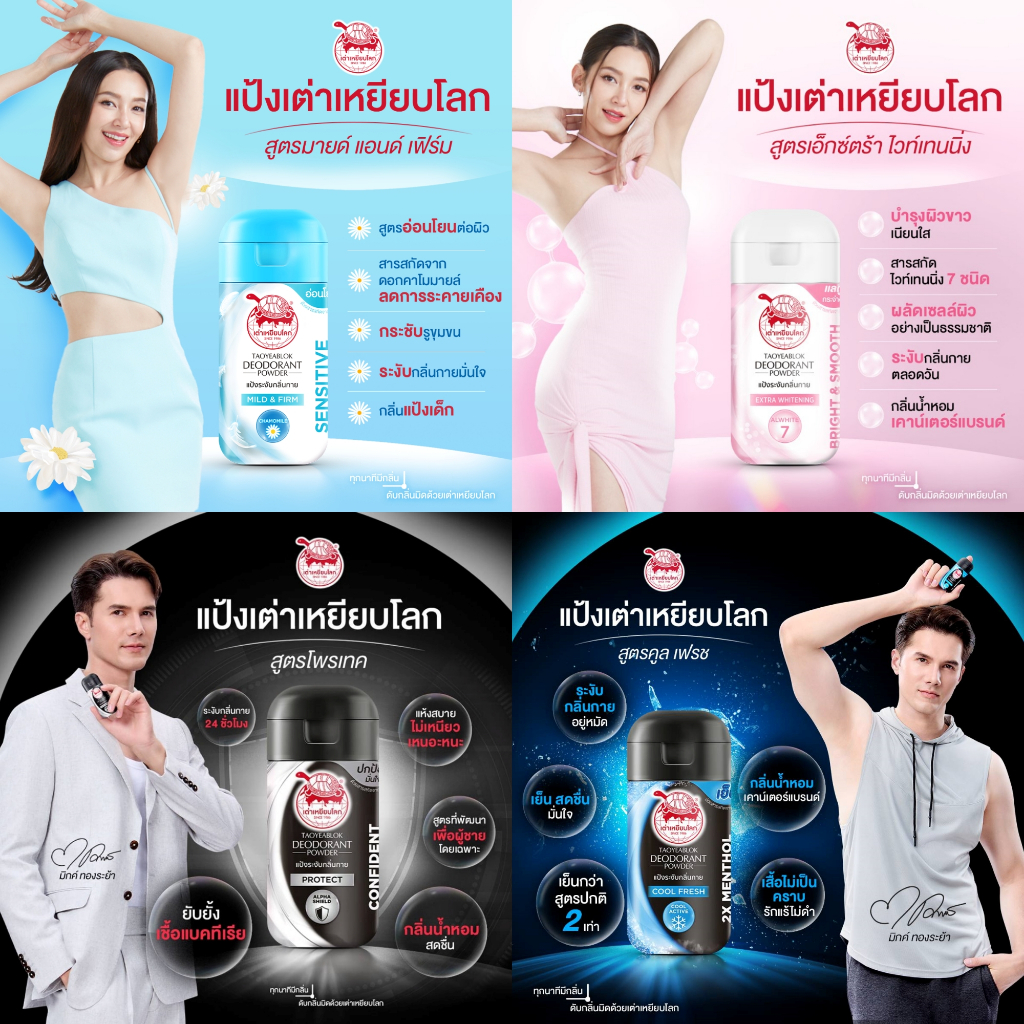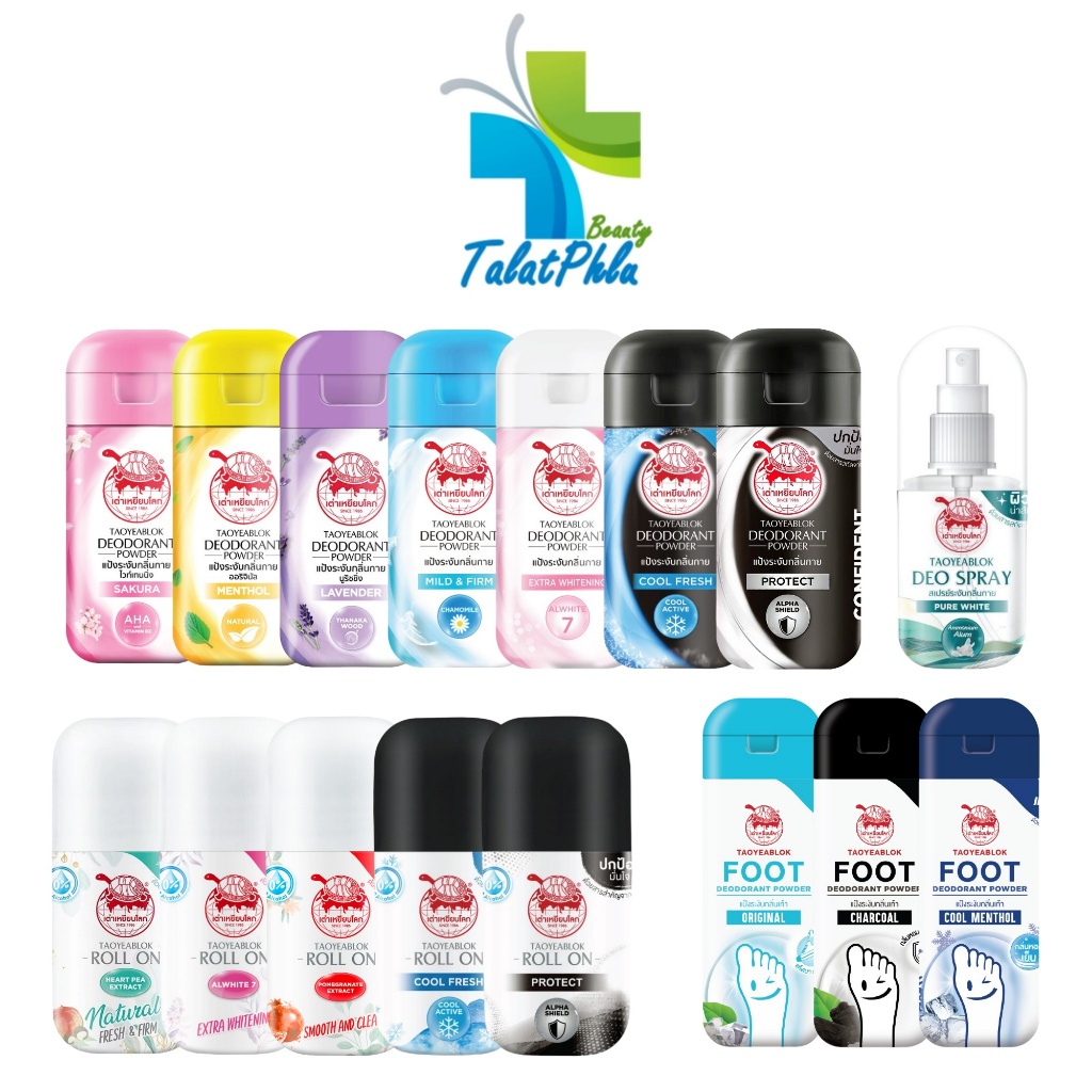 ... นมีให้เลือก 7 สูตร - ไวท์เทนนิ่ง ซากุระ (สีชมพู) : อ่อนโยนต่อผิว มีส่วนผสมจาก AHA , Vitamin B3 ให้ผิวกระจ่างใส - ออริจินัล เมนทอล (สีเหลือง) : เย็น สะอาด ชื่นใจ ลดเหงื่อ แห้งสบาย ให้ผิวเรียบเนียน ไม่ทิ้งคราบเหลือง - นูริชชิ่ง ลาเวนเดอร์ (สีม่วง) : อ่อนโยนต่อผิว มีส่วนผสมของทานาคาช่วยลด ผด ผื่น คัน ผิวเรียบเนียน - มายด์แอนเฟิร์ม คาโมมายล์ (สีฟ้า) : สูตรอ่อนโยนเหมาะสำหรับเด็กนักเรียนหรือคนแพ้ง่าย กลิ่นแป้งเด็ก หอมละมุน - เอ็กซ์ตร้าไวท์ (สีชมพูขาว) : ช่วยให้วงแขนขาว อุดมไปด้วยสารสกัดไวท์เทนนิ่ง 7 ชนิด กลิ่นน้ำหอมสไตล์ยุโรป - คูลเฟรช (ดำฟ้า) : เย็นกว่าสีเหลือง 2 เท่า เหมาะสำหรับผู้ชาย ผู้ที่มีเหงื่อเยอะ หรือมีกลิ่นกายมากกว่าปกติ กลิ่นน้ำหอมแบรนด์เนม - โพรเทค (ดำเทา) : สูตรเข้มข้นสำหรับผู้ชาย ป้องกันแบคทีเรียยาวนาน กลิ่นน้ำหอมแบรนด์เนม วิธีใช้ : ทาวันละ 1 ครั้ง หลังอาบน้ำตอนเช้า โดยหลังจากอาบน้ำไม่ต้องเช็ดรักแร้ให้แห้งสนิท เพียงให้ใช้ผ้าซับแล้วเทแป้งลงฝามือเล็กน้อย ทาลงบนรักแร้ให้ทั่ว (หรือจะบีบขวดเพื่อพ่นผงแป้งที่ใต้รักแร้) รอให้แห้งสักพักค่อยใส่เสื้อตามปกติ ปริมาณบรรจุ 1 ขวด 22 กรัม ------------------------------------------------------------------- แป้งระงับกลิ่นเท้า - ออริจินอล (สีฟ้า) : แอนตี้แบคทีเรีย ช่วยยับยั้งกลิ่นเท้า เหมาะกับการทาเท้า ถุงเท้าหรือรองเท้าสีขาว - ถ่านชาร์โคล (สีดำ) : ยับยั้งกลิ่นอับ ดูดความชื้น สารสกัดจากธรรมชาติ เหมาะกับถุงเท้าหรือรองเท้าสีเข้ม - คูลเมนทอล (สีน้ำเงิน) : ระงับกลิ่นเท้า ลดเหงื่อ สูตรเย็นสดชื่น วิธีใช้ : ทาที่เท้าบาง ๆ ตอนเช้า หรือโรยใส่ถุงเท้า รองเท้า เพื่อความมั่นใจตลอดวัน ปริมาณบรรจุ 1 ขวด 30 กรัม ------------------------------------------------------------------- โรลออนระงับกลิ่นกายมีให้เลือก 5 สูตร - เนเชอรัล (สีขาวเขียว) : สารสกัดจากธรรมชาติ ไม่มีแอลกอฮอล์ ลดการระคายเคืองของผิว ไม่ทิ้งคราบเหลือง รักแร้กระจ่างใส - เอ็กซ์ตร้า ไวท์เทนนิ่ง (สีขาวชมพู) : สารสกัด Alwhire 7 ไม่มีแอลกอฮอล์ ระงับกลิ่นกายตลอดวัน ผิวขาว กระจ่างใสx2 - สมูท แอนด์ เคลียร์ (สีขาวแดง) : สารสกัดจากทับทิม ลดความหมองคล้ำ ไม่มีแอลกอฮอล์ กลิ่นหอมอ่อนๆ แห้งไว สบายผิว - คลูเฟรช (สีดำฟ้า) : โรลออนระงับกลิ่นกายสูตรเย็น ไม่มีแอลกอฮอล์ เนื้อบางเบา แห้งเร็ว ไม่เหนอะหนะ เหมาะสำหรับผู้ชาย - โพรเทค (สีดำเทา) : สูตรเข้มข้น ระงับกลิ่นยาวนาน ป้องกันแบคทีเรีย ไม่มีแอลกอฮอล์ เหมาะสำหรับผู้ชาย วิธีใช้ : ทาวันละ1ครั้งตอนเช้าเพื่อความมั่นใจตลอดวัน ปริมาณบรรจุ 1 ขวด 30 มล. ------------------------------------------------------------------- สเปรย์ระงับกลิ่น - สูตรเพียวไวท์ : สเปรย์สารส้ม ไม่มีแอลกอฮอล์ ไม่ทำให้