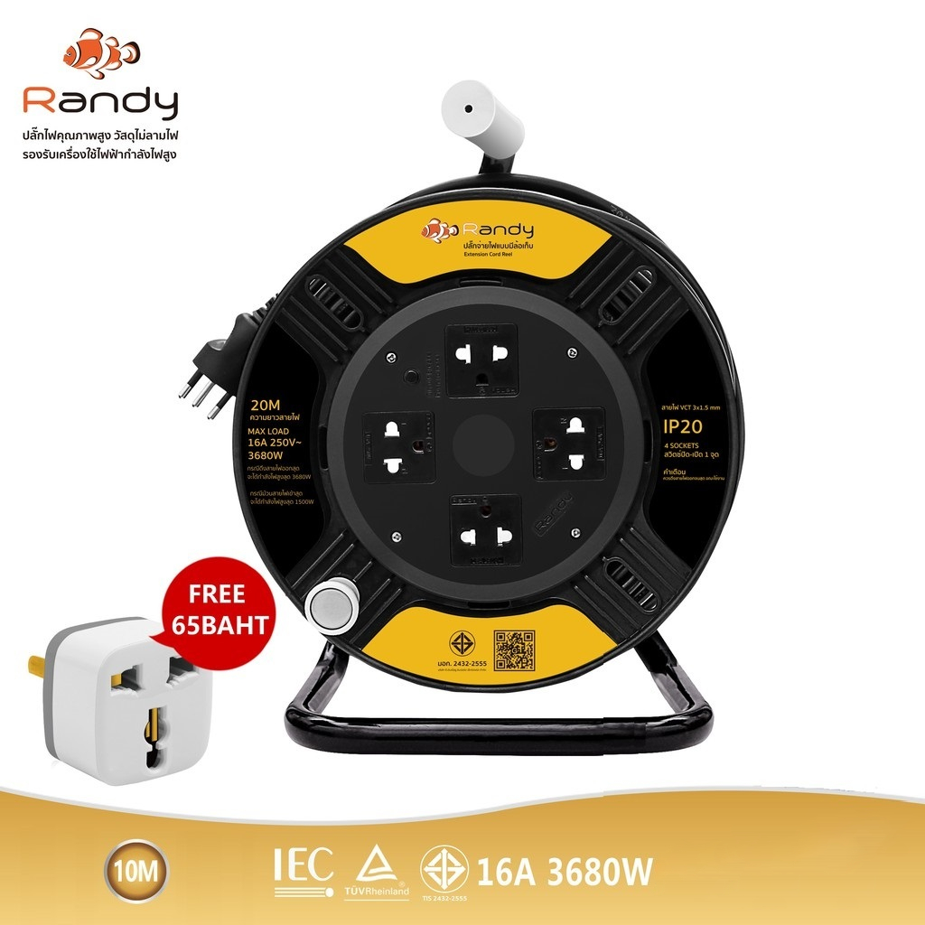 RANDYล้อเก็บสายไฟ 4ช่อง VCT1.5x3 ปลั๊กไฟ ประกัน5ปี 16A3680W ยาว10 20 30M กันไฟสองชั้น พลาสติกวิศวกรรมแข็งแรงไม่รั่วไฟฟ้า