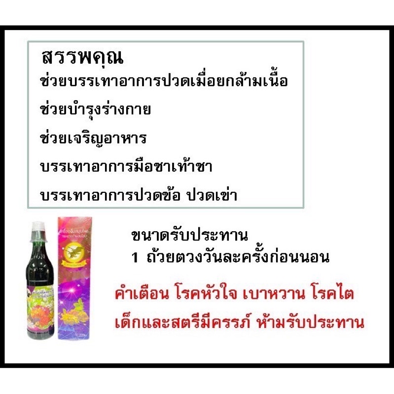 เครื่องดื่มสมุนไพรกระชายดำผสมโสม ตรานกอินทรีย์คู่ ของแท้จากโรงงานผลิตมีกล่องขนาดบรรจุ 630 มิลลิลิตร 1 ขวด - บรรเทาอาการปวดเมื่อยตามร่างกาย ปวดหลัง ปวดเอว ปวดขา ช่วยบำรุงหัวใจ ช่วยเจริญอาหาร ส่วนประกอบสำคัญ : เหง้ากระชายดำ 20% เถาวัลย์เปรียง 10% ผลเก๋ากี้ 5% รากชะเอมเทศ 3% ดอกเห้ดห