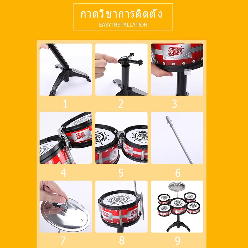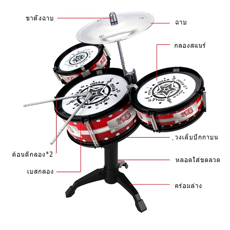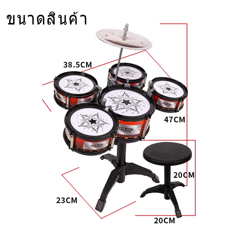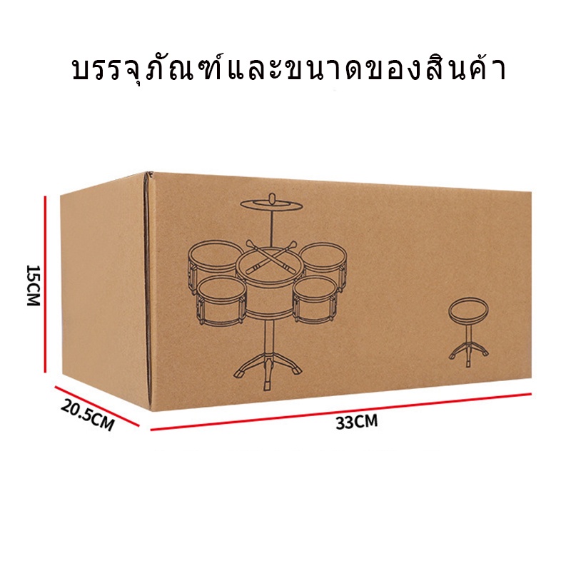 จัดส่งจากกรุงเทพฯ ประเทศไทย ภายใน 1-2 วันหลังจากสั่งซื้อ "ในชุดประกอบด้วย 1. กลอง Bass 1 ชิ้น (ขนาด 38 ซม) 2. กระเดื่องกลองแบบเหยียบ 1 ชิ้น 3. กลอง Tom ขนาดใหญ่ 1 ชิ้น (ขนาด 20 ซม) 4. กลอง Tom ขนาดเล็ก 1 ชิ้น (ขนาด16 ซม) 5. กลอง Tom จิ่ว 2 ชิ้น (ขนาด 13 ซม.) 6. ฉาบ 1 ชิ้น (ขนาด 23 ซม.) 7. ไม