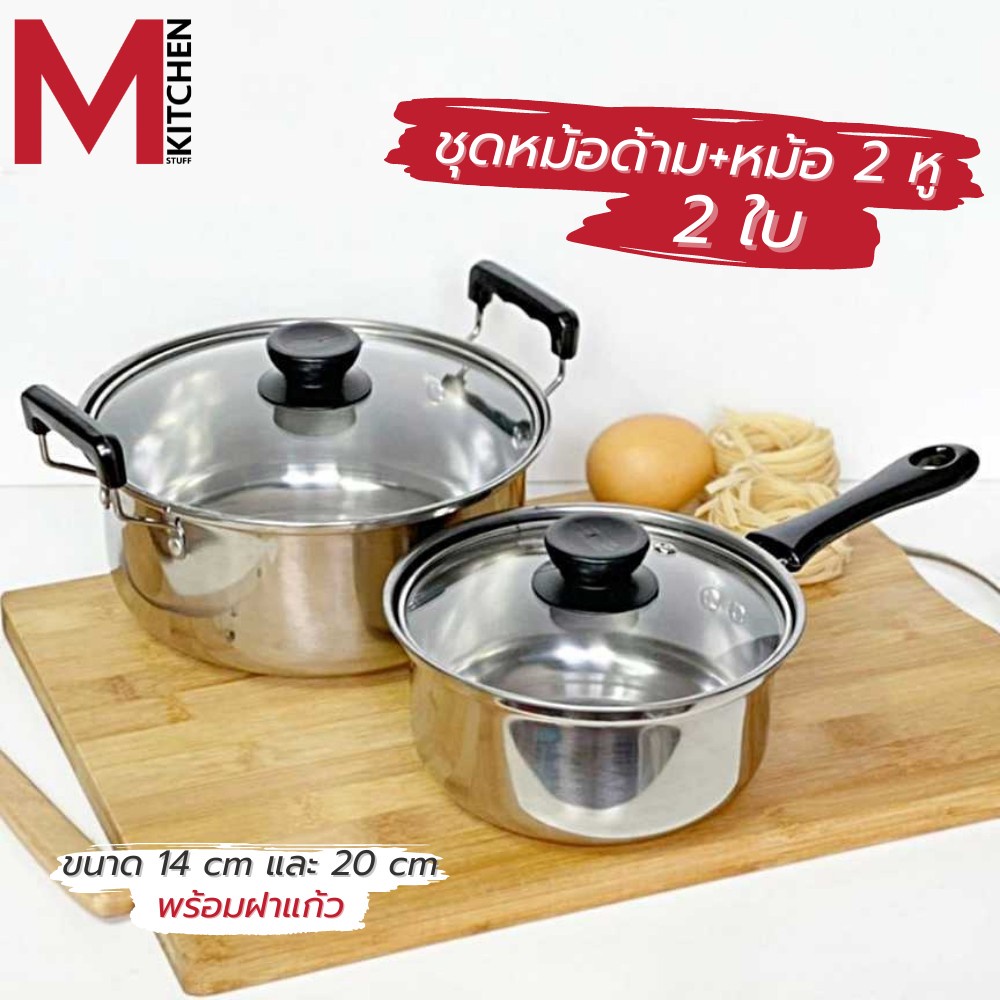 M KITCHEN 1420 ชุดหม้อด้ามและหม้อสองหู2ใบ ขนาด 14- 20 ซม. พร้อม ฝาแก้ว หม้อ หม้อด้าม หม้อสองหู (B1)