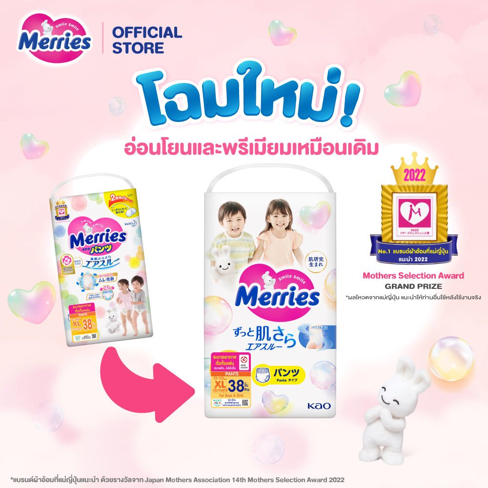 โฉมใหม่!! Merries Japan Pants (ผ้าอ้อมเด็กเมอร์รี่ส์แบบกางเกง) ถูกใจแม่และลูกที่ผิวแพ้ง่าย ผ้าอ้อมที่มาพร้อมรูระบายอากาศมากขึ้น 5,000 ล้านรู*ระบายอากาศ! อ่อนโยน ก้นเจ้าตัวเล็กไม่อับชื้น สวมใส่แบบไหนก็ยืดหยุ่น รองรับทุกการเคลื่อนไหว แม่สบายใจ ลูกยิ้มได้กว่าที่เคย เมอร์รี่ส์ No.1 Brand ที่แม่ญี