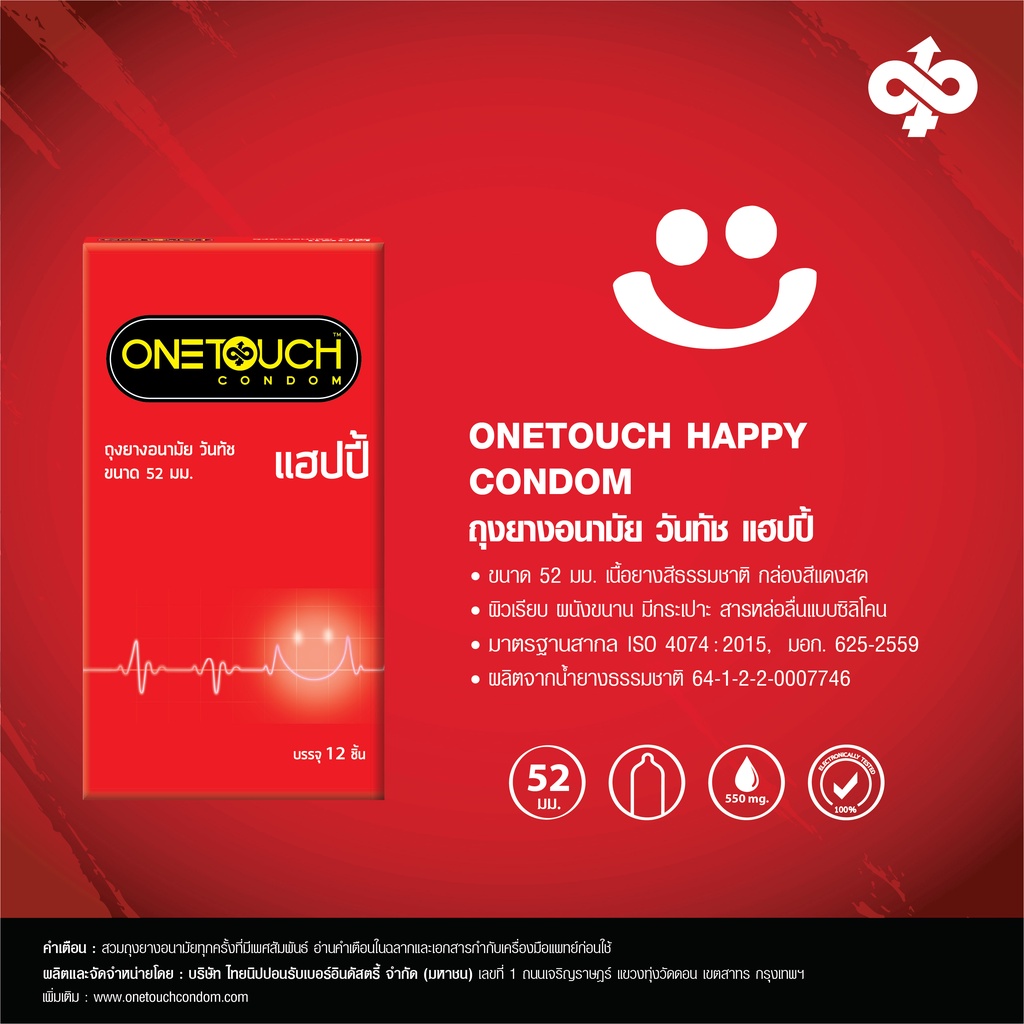 ขนาด 52 มม. เนื้อยางสีธรรมชาติ กล่องสีแดง ผิวเรียบ ผนังขนาน มีกระเปาะ ใส่สารหล่อลื่นมากกว่า 550 มล. ผลิตจากน้ำยางธรรมชาติ มาตรฐานสากล ISO 4074: 2015 มอก. 625-2559 ใบอนุญาตเครื่องมือแพทย์เลขที่ 64-1-2-2-0007746