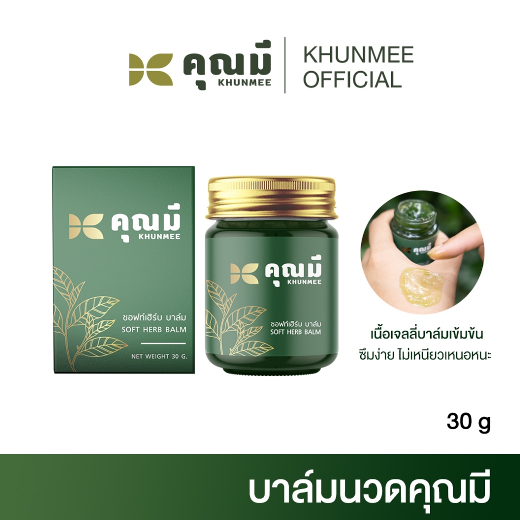 กรีนบาล์ม ตราคุณมี GREEN BALM KHUNMEE BRAND บาล์มนวดสมุนไพรคุณมี สูตรตำรับแผนไทย . . ควบคุมการผลิตโดยเภสัชกรแพทย์แผนไทย . . ทะเบียนเลขที่ G253/66 มี ขนาดบรรจุ 30 กรัม . # ส่วนประกอบสำคัญ # ใน 220 กรัม เตรียมจากส่วนประกอบสำคัญ ไพล 20 กรัม เถาเอ็นอ่อน 20 กรัม โคคลาน 20 กรัม และอื่นๆ .