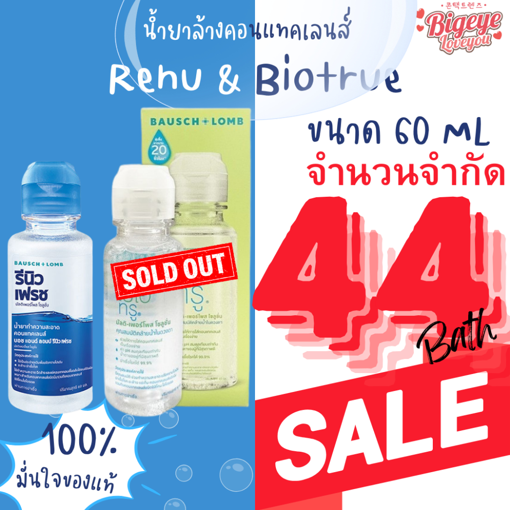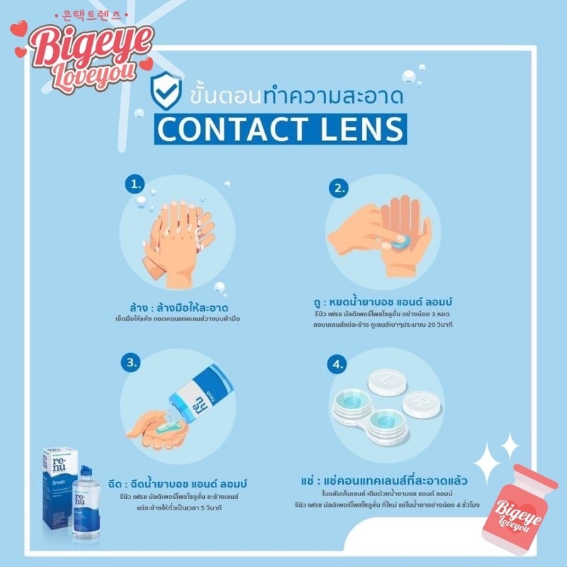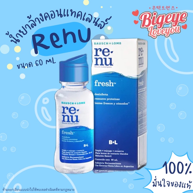 💦 Renu fresh multi-purpose solution น้ำยาล้างแช่คอนแทคเลนส์ 60 ml. ใช้ ทำความสะอาดและขจัดคราบสะสมของฟิลม์โปรตีน หรือสิ่งสกปรกที่ติดอยู่ให้ออกจากคอนแทคเลนส์ชนิดเนื้อนิ่มสามารถขจัดคราบ โปรตีนได้อย่างมีประสิทธิภาพเมื่อให้เป็นประจำทุกๆวัน ฆ่าเชื้อโรคที่ติดอยู่ที่ผิวของคอนแทคเลนส์ ใช้ล้าง ให้เก็บรักษา
