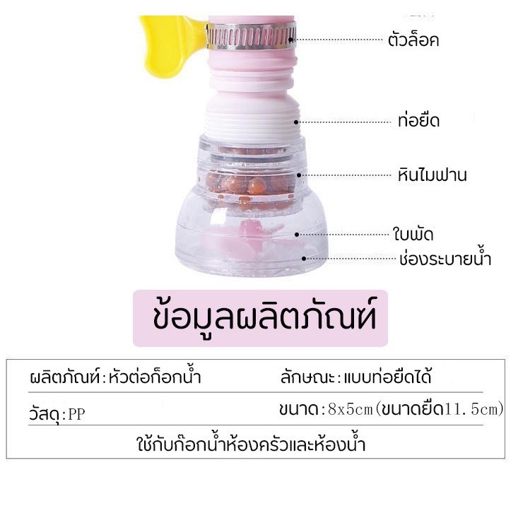 หัวต่อก๊อกน้ำ หัวต่อกันน้ำกระเด็น ก๊อกต่อหมุนได้ 360 องศา มีหินกรองน้ำ มี 3 สี สีฟ้า สีเขียว สีชมพู