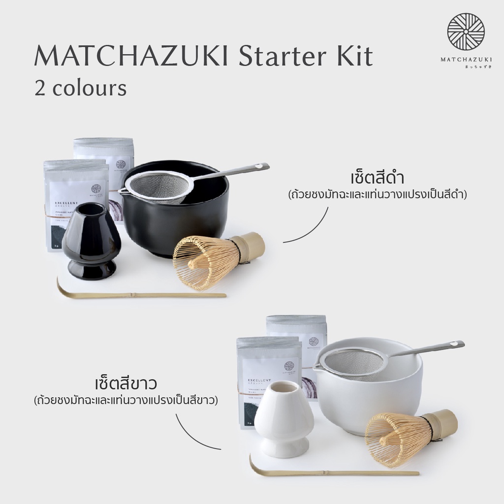 ... ค้าท่านใดที่ต้องการใบกำกับภาษี รบกวนแจ้งรายละเอียดในช่องหมายเหตุได้เลยค่าา . ✨ซื้อ 3 เซ็ตขึ้นไปมีราคาส่ง กดเพิ่มจำนวน จะขึ้นราคาส่งให้อัตโนมัติค่า (สำหรับซื้อ 10 เซ็ตขึ้นไป ติดต่อแอดมินขอราคาพิเศษได้เลยนะค้าา) ____________ (พร้อมส่งค่าา ^^ มีห่อผ้าให้พร้อมการ์ดแบบในรูปเลยค่าา) เซ็ตนี้เหมาะสำหรับใคร ? • คนที่เพิ่งเริ่มเข้าวงการมัทฉะ ไม่มีอุปกรณ์ ไม่รู้ว่าต้องใช้อะไรบ้าง จะเลือกใช้มัทฉะเกรดไหนดี ไม่แน่ใจว่าต้องชงยังไง • คนที่มองหา #ของขวัญ สุดพิเศษ พรีเมียม ห่อด้วยผ้าแบบญี่ปุ่น สวยงาม มีการ์ดแนบส่งถึงผู้รับได้ (แจ้งเพิ่มในหมายเหตุ) • ร้านคาเฟ่ ร้านกาแฟ ที่เปิดใหม่ หรืออยากจะมีเมนูมัทฉะ มีอุปกรณ์มัทฉะแบบพร้อมชง ครบเซ็ต แถมได้ชาทุกเกรดไปทดลองก่อนเลือกซื้อปริมาณเยอะๆ __________ หากคุณเป็นผู้ที่หลงใหลในชาเขียวมัทฉะ และอยากจะเรียนรู้ศิลปะในการชงชา แต่ไม่รู้ว่าจะเริ่มต้นอย่างไร ไม่รู้ว่าจะเลือกใช้มัทฉะเกรดไหน จึงจะเหมาะกับเครื่องดื่มหรือของหวานของคุณ อุปกรณ์ชงชา จำเป็นจะต้องซื้ออะไรบ้าง ใช้งานอย่างไร เก็บรักษาอย่างไร ขอแนะนำ ✨ ชุดชงชาเริ่มต้นจาก MATCHAZUKI ✨ ภายในเซ็ตประกอบไปด้วยอุปกรณ์พื้นฐานที่จำเป็นสำหรับการชงชาทั้งหมด และผงมัทฉะชุดทดลองครบทุกเกรด ให้คุณได้เปิดประสบการณ์ในการชงมัทฉะ และสร้างสรรค์เมนูที่หลากหลาย ____________________________ ในชุดชงชาเริ่มต้น Starter Kit (มีให้เลือกทั้งเซ็ตขาวและเซ็ตดำ) ประกอบด้วย 1. ชุดทดลอง Matcha Sample Set จำนวน 2 ชุด (1 ชุดรวม 5 เกรด) ให้คุณลูกค้าได้ลองความแตกต่างของมัทฉะทั้ง 5 เกรด ก่อนตัดสินใจสั่งซื้อ ชุดทดลอง 1 ชุดประกอบด้วย ผงมัทฉะ 5 เกรด เกรดละ 2 ซอง (รวม 10 ซองต่อชุด) (*ซองขนาด 3 กรัม) ซึ่งผงมัทฉะ 3 กรัมจะมีปริมาตรประมาณ 1 ช้อนชา ใช้ชงมัทฉะลาเต้ได้ 1 แก้ว - Excellent มีสีเขียวมรกต กลิ่นหอม ไม่ขม นุ่มนวล - Medium มีสีเขียวสว่าง กลิ่นหอม และขมน้อย กลมกล่อม - Classic มีสีเขียวอ่อน กลิ่นหอม ติดรสขมนิดๆ - Houjicha สีจะออกน้ำตาล เป็นผงชาเขียวคั่ว กลิ่นหอม ไม่ขม - Genmaicha ผงชาเขียวผสมข้าวคั่วญี่ปุ่น กลิ่นหอมข้าวคั่วญี่ปุ่น **พิเศษ ชุดทดลอง 2 ชุดสามารถนำมาแลกส่วนลดมูลค่า 200 บาท เพื่อใช้สำหรับการซื้อสินค้าในรอบถัดไป บนเว็บไซต์ของ matchazuki (เฉพาะลูกค้าที่ยังไม่เคยใช้สิทธิส่วนลดจากชุดทดลองเท่านั้น)** 2. แปรงชงชา (Chasen) ทำจากไม้ไผ่ นำมาเหลาเป็นแฉกและดัดจนได้รูป ชาเซ็นเป็นอุปกรณ์สำคัญที่ช่วยบดผงมัทฉะไม่ให้จับตัวเป็นก้อน และละลายเข้ากับน้ำได้ง่าย 3. แท่นวางแปรงชงชา (Kusenaoshi) ทำมาจากเซรามิกเนื้อดี เป็นภาชนะสำหรับวางแปรงชงชาเพื่อผึ่งให้แห้ง ป้องกันไม่ให้เกิดเชื้อรา และรัก