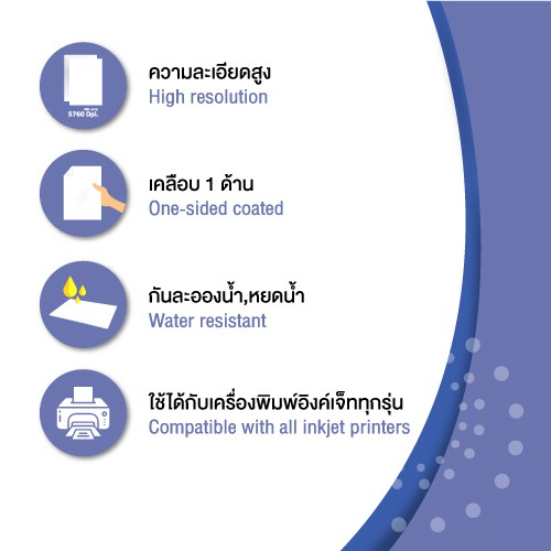 คุณสมบัติ - กระดาษเนื้อสีขาวเคลือบน้ำยาพิเศษเกรด Premium ผิวมัน สำหรับเครื่องพิมพ์ Inkjet - รองรับงานความละเอียดสูง, สีสันคมชัด - น้ำหมึกแห้งเร็ว - มีคุณสมบัติ Water resistant สามารถทนต่อละอองน้ำ - เหมาะสำหรับงานพิมพ์ภาพถ่าย, งานกราฟฟิค, งานพรีเซนเทชั่น, งานโฆษณา, โปสเตอร์ - บรรจุภัณฑ์ป้องกั