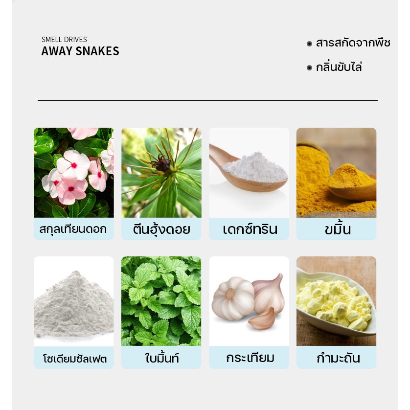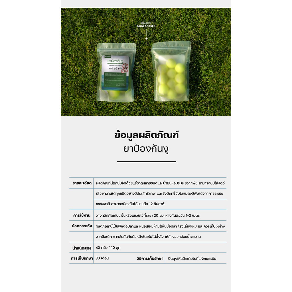 ... ู และแมลงมีพิษไม่ชอบ - ยาป้องกันงู จะส่งกลิ่นกระจายให้งูและแมลงมีพิษที่อยู่ตามมุมอับออกมาและหนีไป - ข้อควรระวัง! เก็บให้ห่างจากเด็ก หลีกเลี่ยงการสัมผัสโดยตรง - คำเตือน!! งูและแมลงมีพิษเป็นสัตว์ที่อันตราย หากพบเจอไม่ควรเข้าไปใกล้