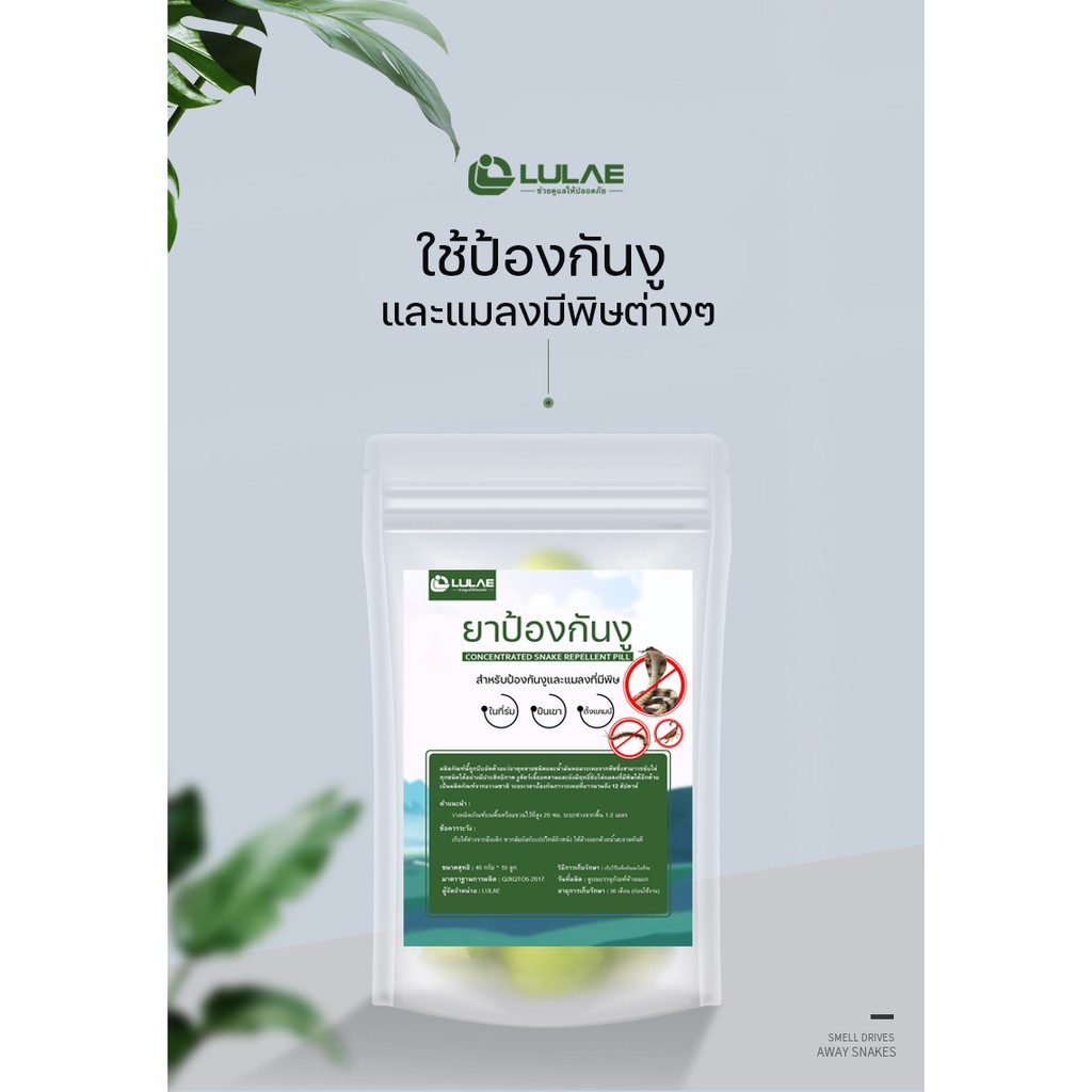 LULAE ช่วยให้ปลอดภัย ยาป้องกันงู ยาไล่งู แมลงมีพิษต่างๆ ช่วยป้องกันภายในตัวบ้าน ช่วยปกป้องการตั้งแคมป์ จากงูและแมลงมีพิษ - แพ็คละ 10 ลูก - น้ำหนักสุทธิ 40 กรัม - อายุการใช้งาน 12 สัปดาห์ - การใช้งาน วางที่พื้นหรือแขวนด้วยความสูง 10-20 ซม.จากพื้น ห่างกัน 1-2 เมตร - ผลิตจากแร่ธาตุหลายชนิดที่ง