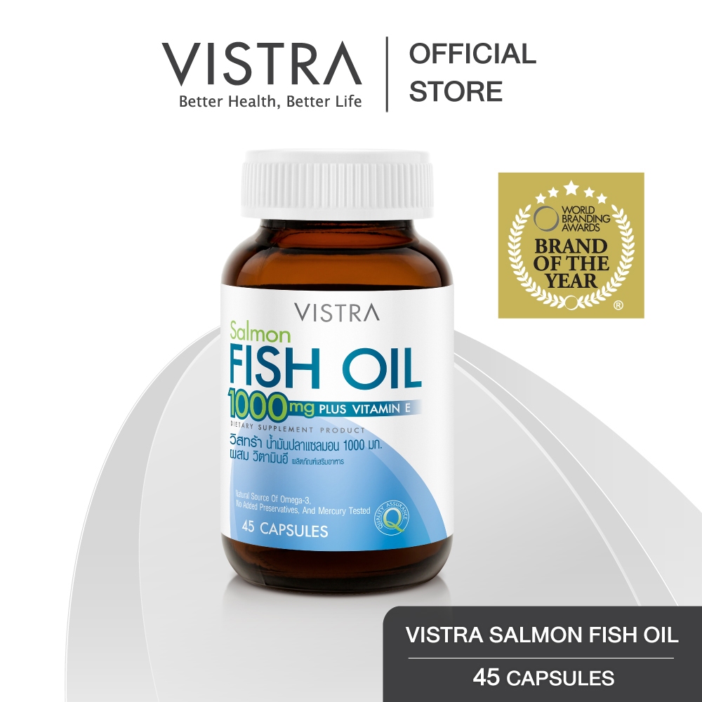 VISTRA Salmon Fish Oil 1000 mg Plus Vitamin E วิสทร้า น้ำมันปลาแซลมอน 1000 มก. ผสม วิตามินอี (ผลิตภัณฑ์เสริมอาหาร) ส่วนประกอบ ส่วนประกอบที่สำคัญใน 1 เม็ด ประกอบด้วย – น้ำมันปลาแซลมอน 1000 มก. ให้กรดไขมันกลุ่มโอเมก้า-3 350 มก. – กรดไอโคซาเพนตาอิโนอิก Eicosapentaenoic Acid (EPA) 180 มก.
