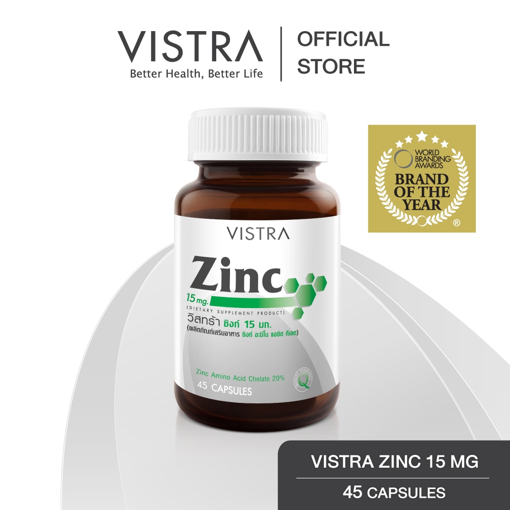 VISTRA Zinc 15mg วิสทร้า วิตามินซิงก์ 15 มก. (ผลิตภัณฑ์เสริมอาหาร) ส่วนประกอบ ส่วนประกอบที่สำคัญใน 1 แคปซูล ประกอบด้วย ซิงก์ อะมิโน แอซิด คีเลต (ให้ซิงก์ 15 มิลลิกรัม) 75 มก. วิธีการรับประทาน รับประทานครั้งละ 1 แคปซูล พร้อมมื้ออาหาร วิตามิน Zinc (ซิงก์) แร่ธาตุสำคัญที่จำเป็นสำหรับทุกช่วงวัย