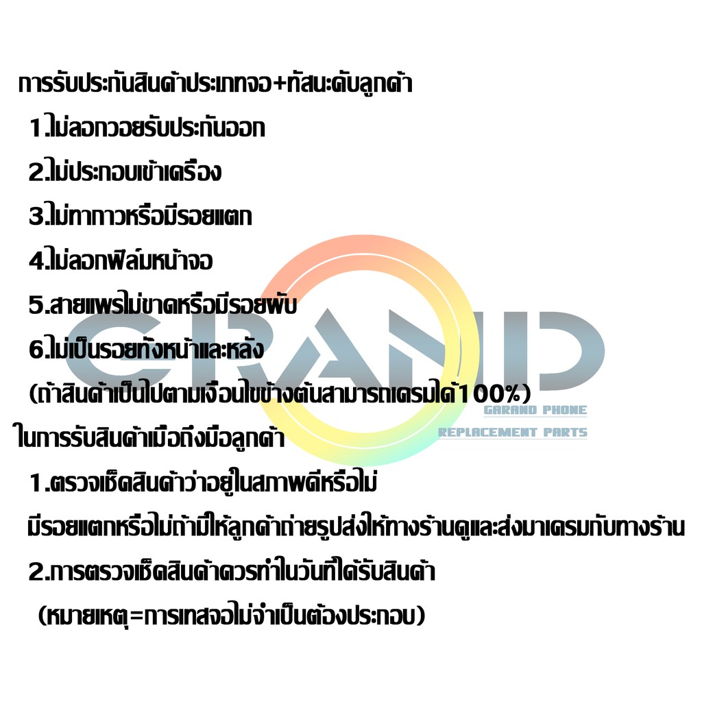 ... รถสั่งซื้อสินค้านี้ได้ค่ะ สินค้าของเราสั่งจากโรงงานที่ผลิตอะไหล่โทรศัพท์มือถือแบร์นชั้นนำโดยตรง เราเน้นสินค้าที่ได้มาตรฐานและมีคุณภาพพร้อมกับการบริการซื้อขายที่ดีที่สุดให้กับลูกค้าทุกท่าน เรามีแอดมินคอยให้คำแนะนำและข้อมูลต่างๆแก่ลูกค้า หากมีข้อสงสัยหรือต้องการข้อมูลเพิ่มเติมสามารถแชทสอบถามได้ ช่วงเวลาที่ลูกค้าจะได้รับความสะดวกมากที่สุดคือ เวลา10.00-19.00 ก่อนรับสินค้าทุกครั้ง ลูกค้าควรตรวจสอบสภาพสินค้าว่าไม่เกิดความเสียหายใดๆ ลูกค้าควรทดสอบสินค้าเบื้องต้นด้วยการลองเสียบแพรจอและแพรทัสกรีนนอกเครื่องและทดลองใช้งานก่อนจะลอกฟิล์มหรือติดกาวประกอบเข้ากับอุปกรณ์โทรศัพท์มือถือของลูกค้า เงื่อนไขการรับประกันสินค้า หน้าจอไม่มีรอยแตกร้าว/แพรไม่มีรอยขาด/ไม่มีรอยแกะฟิล์มหน้าหลังจอออก/ไม่มีรอยติดกาว/ไม่มีรอยประกอบเข้าเครื่อง (หากสินค้าไม่อยู่ในสภาพตามเงื่อนไขจะทำให้สินค้าหมดประกัน ไม่สามารถคืนหรือเคลมได้ทันทีครับ)ซื้อจอมีของแจกฟรี แถมชุดแกะจอ ประกอบด้วย 1.ชุดไขควง มาตราฐานช่าง สามารถแกะเปลี่ยนแบตเตอรี่ได้เอง 2.ชุดไขควงแบบ 4 แฉก 3.ชุดไขควงปากแบน 4.ชุดไขควงแบบดาว 5.แฉกPrying tool (ปากแบน) ใหญ่สำหรับแกะแบต 6.Suctions Cup ถ้วยดูดกระจกหน้าจอ 7.ปิ๊กพลาสติกบาง สำหรับสอดรองขอบจอ ผลิตภัณฑ์ทั้งหมดของเราได้รับการทดสอบโปรดอ่านคู่มือการรับประกันหลังจากได้รับสินค้าหากคุณมีคำถามใด ๆ โปรดติดต่อเราในเวลาเราจะให้บริการคุณด้วยใจจริง
